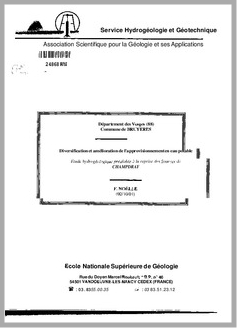 H 1 Diversification et amélioration de l'approvisionnement en eau potable. Etude hydrogéologique préalable à la reprise des sources de Champdray commune de Bruyeres. 88