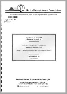 H 1 Commune de Aumontzey (Vosges). Protection et régularisation administrative des sources du Bois de Creux. Additif. Analyses compètes. Notice d'incidence