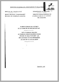 H 1 ALIMENTATION EN EAU POTABLE DE LA COMMUNE DE BOULZICOURT.NOTE TECHNIQUE RELATIVE AU POMPAGE D'ESSAI DE LONGUE DUREE EN JUILLET ET AOUT 1985 SUR LE FORAGE DE RECONNAISSANCE DU LIEU-DIT LE ROUGE BIOUT