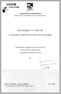 H 1 Département de la Meuse. Connaissance et maîtrise des ressources en eau souterraine. Recensement et diagnostic des forages d'essai et piézomètres du département. Arrondissement de Bar le Duc.