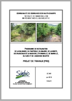 Le présent rapport de Projet (PRO) fait suite à l’Avant-Projet (AVP). Cette phase de PRO tient compte de l’ensemble des réponses des propriétaires de terrains, de parcelles enrésinées ou d’ouvrages hydrauliques qui ont été consultés, rencontrés ou qui ont été destinataires de courriers de demandes d’autorisations pour la réalisation des travaux. Le programme de travaux porte sur 11 cours d’eau qui s'écoulent sur 9 communes regroupées en 2 Communautés de Communes (Hauts-Champs et Ban d’Etival, associées par le biais d’un groupement de commande).