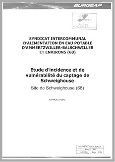 H 1 Syndicat Intercommunal d'alimentation en Eau potable d'Ammertzwiller Balschwiller et environs. Etude d'incidence et de vulnérabilité du captage de Schweighouse (Haut Rhin). Site de Schweighouse. Rapport final