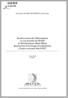 H 1 Renforcement de l'alimentation en eau potable du SIAEP de Bréchaumont (Haut Rhin). Réalisation d'un forage d'exploitation d'indice national 44-3-0227