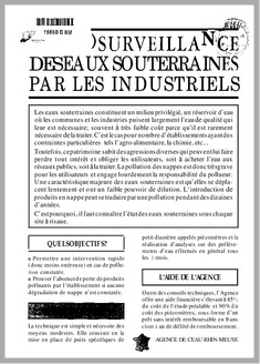 PLAQUETTE DESTINEE AUX INDUSTRIELS ET LEUR DONNANT LES ELEMENTS TECHNIQUES POUR ASSURER LA SURVEILLANCE OU LE DIAGNOSTIC DES EAUX SOUTERRAINES. CONTAMINATION DES NAPPES PHREATIQUES, MOYENS TECHNIQUES A METTRE EN OEUVRE. CONTENU TECHNIQUE DE L'ETUDE HYDROGEOLOGIQUE PREALABLE.