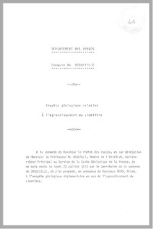 H 1 Commune de Dogneville (Vosges). Rapport d'enquête géologique relatif au cimetière communal.
