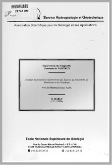 H 1 Mesures de protection réglementaire des Sources du Bonhomme, de Moinehaye et de Grandrupt. Commue de Taintrux. Vosges. Avis de l'hydrogéologue agréé