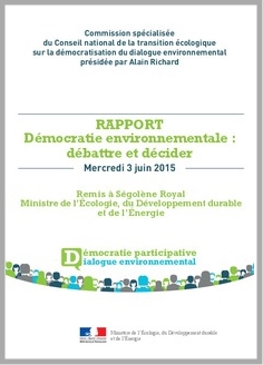 La ministre de l'Écologie, du Développement durable et de l'Énergie, Ségolène Royal, a reçu le rapport “Démocratie environnementale : débattre et décider”, en présence des membres de la commission spécialisée du Conseil national de la transition écologique sur la démocratisation du dialogue environnemental présidée par le sénateur PS du Val-d'Oise Alain Richard. Après la mort du jeune manifestant Rémi Fraisse sur le chantier du barrage de Sivens, dans le Tarn, François Hollande avait souhaité que le gouvernement présente, dans les six mois, des porpositions sur la “démocratie participative”. En ce sens, la commission appelle, notamment, à “l'organisation d'une participation du public en amont d'un projet, dès le stade de l'avant-projet ou du programme qui le fonde”.